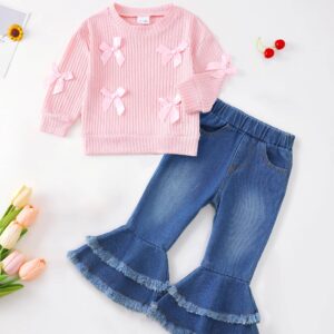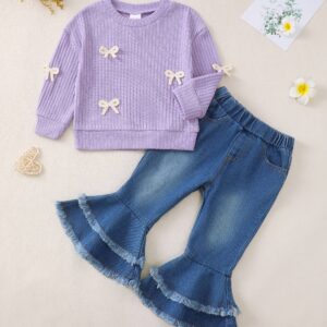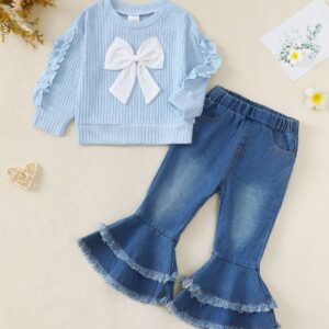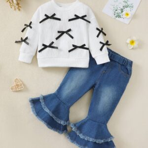 Toddler Baby Girl Clothes Fall Winter Outfit, Bow Sweatshirt Denim Bell Bottom Jeans Outfits