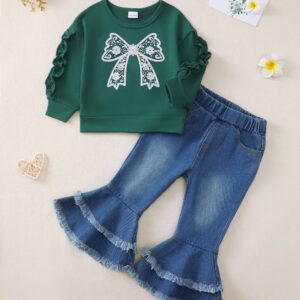 Toddler Baby Girl Clothes Fall Winter Outfit, Bow Sweatshirt Denim Bell Bottom Jeans Outfits