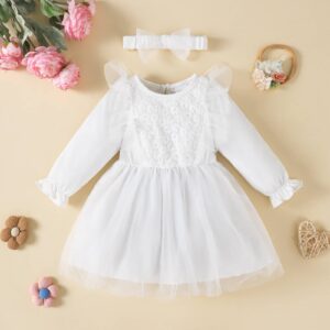 Baby Girl Tutu Dress Ruffle Long Sleeve Baptism Dress with Flower Headband